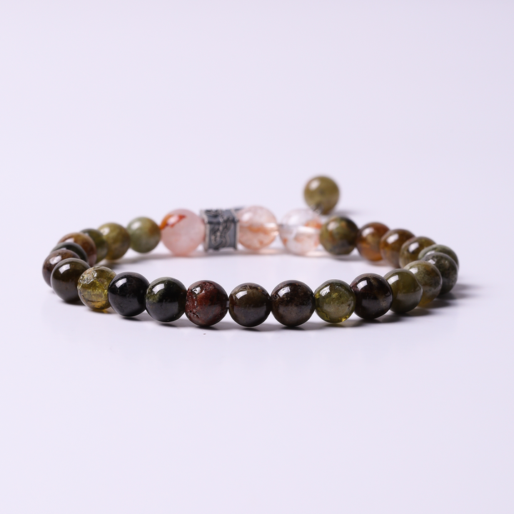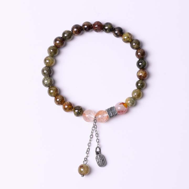 Blending green garnet and red phantom crystals, this bracelet is a natural energy blend. Green garnet boosts vitality and balance, while red phantom crystals infuse passion and clarity. A perfect companion for daily life, it merges earthy charm with spiritual power to energize your journey.
